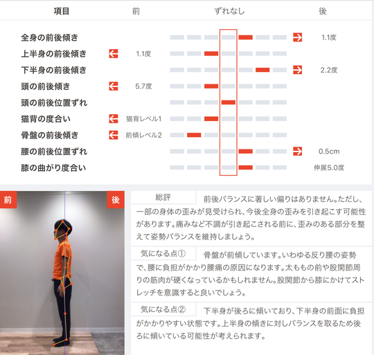 初回・中間・改善後の姿勢データを比較し、変化を共有することで、施術効果を感覚ではなく事実として理解できる。