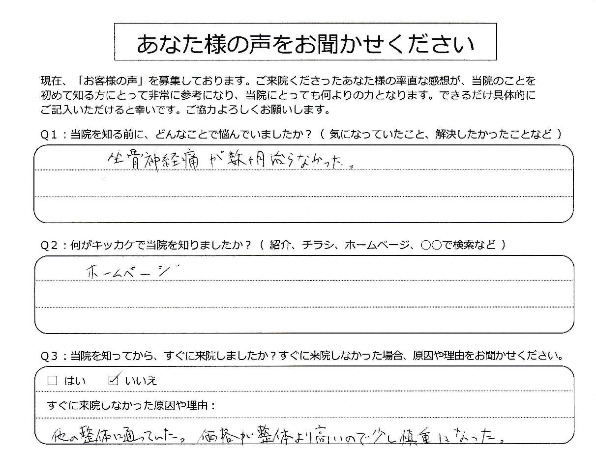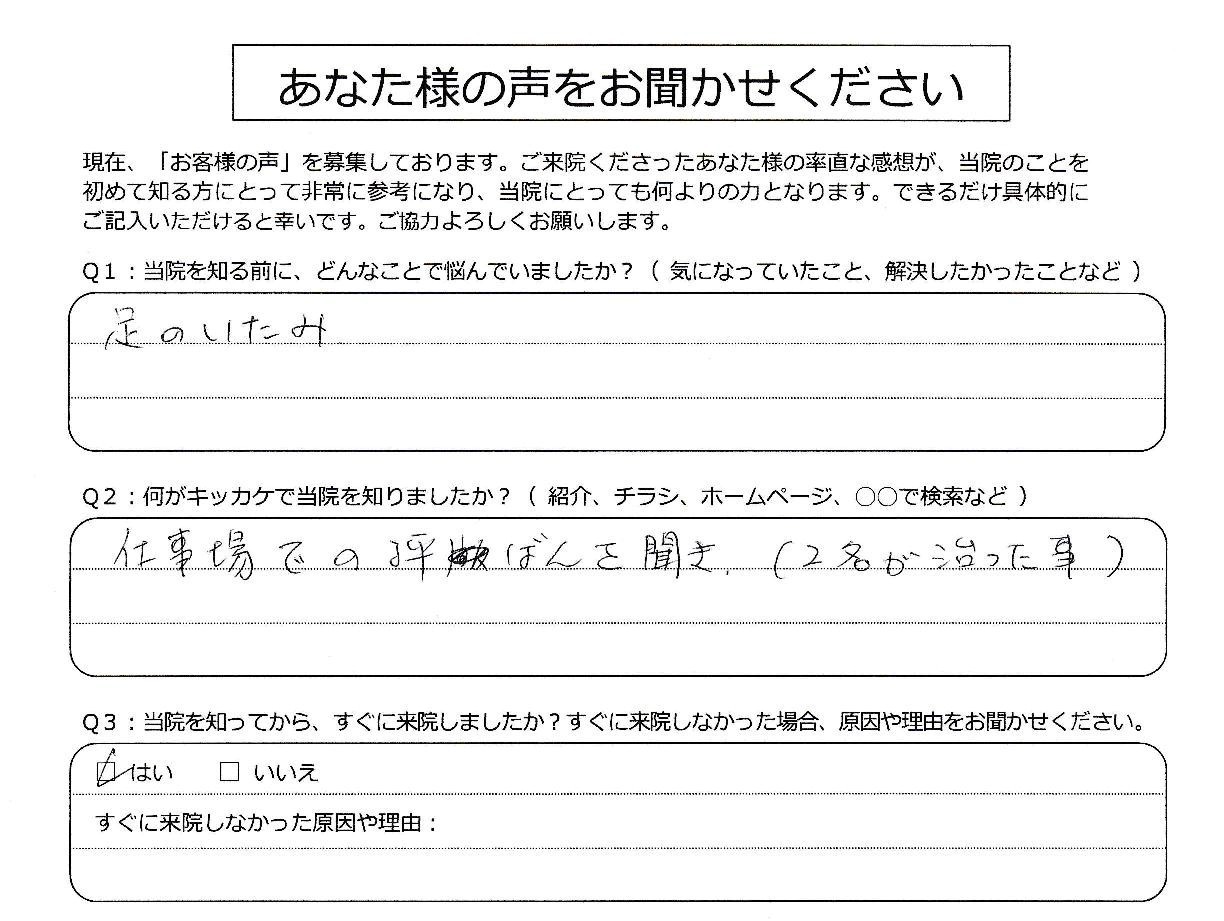 職場で2名の方から治ったと評判を聞き、自分自身も今後の治療に期待が持てたので、家族や友人にもお勧めしたいです。今後ともよろしくお願いします。