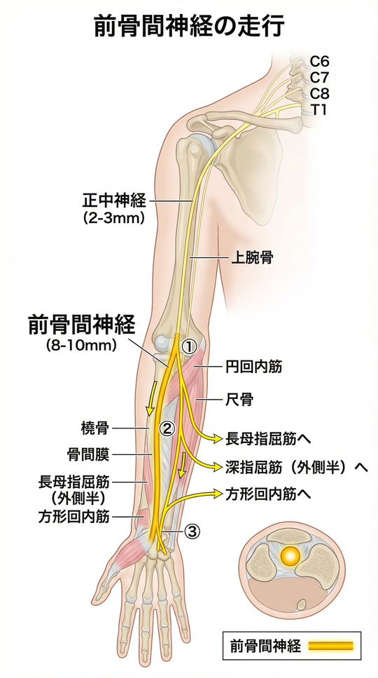 前骨間神経は、正中神経から分岐する運動神経主体の枝であり、皮膚の感覚(しびれ)をほとんど担当しない。