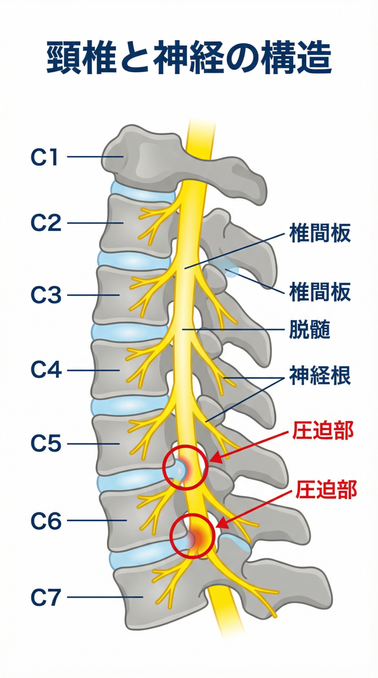 頚椎症によるしびれや違和感は、単に「骨が変形しているから」だけで起こるものではない。