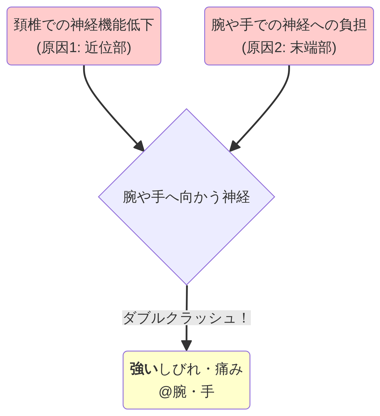 神経の近位部での働きの低下が、末梢(腕・手指)への神経伝達に影響を及ぼしやすくなる