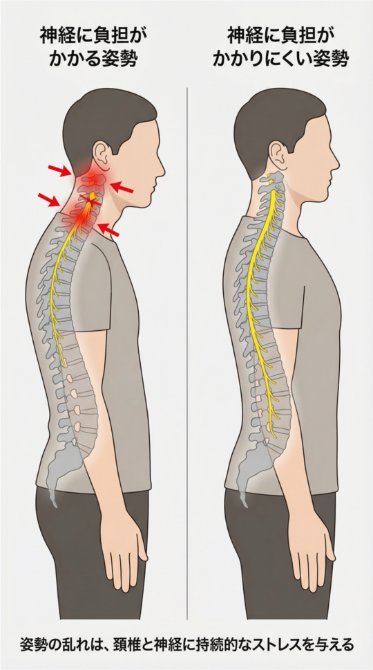 といった変化が重なると、神経が圧迫・牽引・摩擦を受けやすくなり、