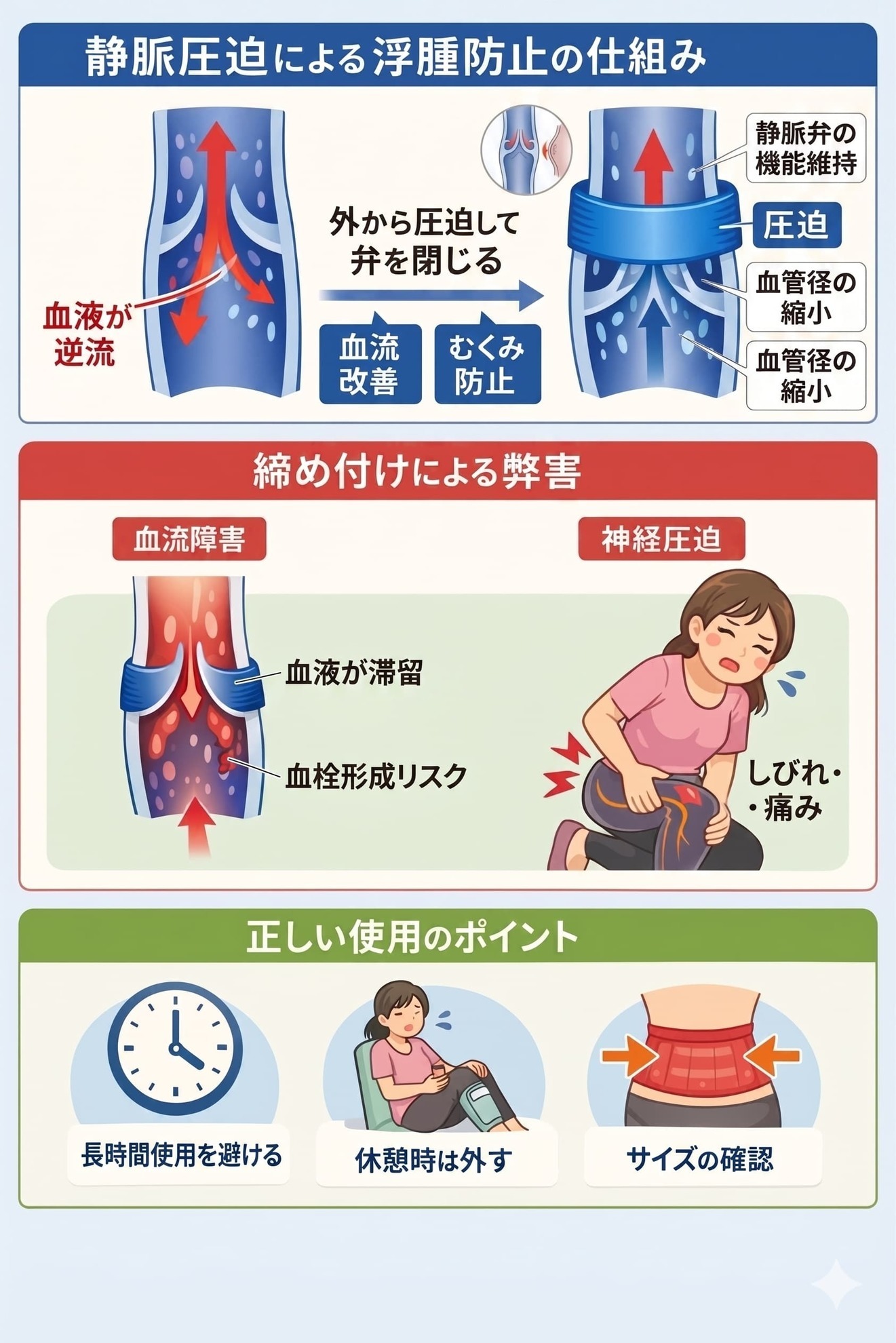 すると、本来戻るはずの血液がその場に滞留し、逆に循環が悪くなる。