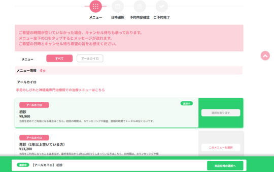 いずれも完全予約制であり、確実に施術時間が確保されるため安心である。
