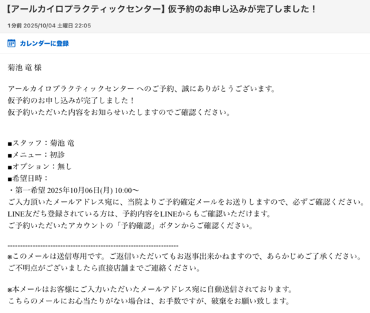 確認メッセージが届き次第、予約は確定する。以後の変更やキャンセルもLINE上で完結できるため便利である。