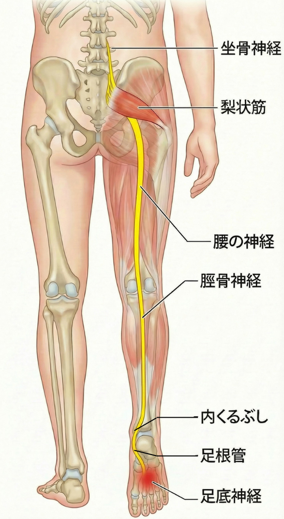 足の裏のしびれが続く場合は、足だけではなく神経の走行全体を確認することが重要である。