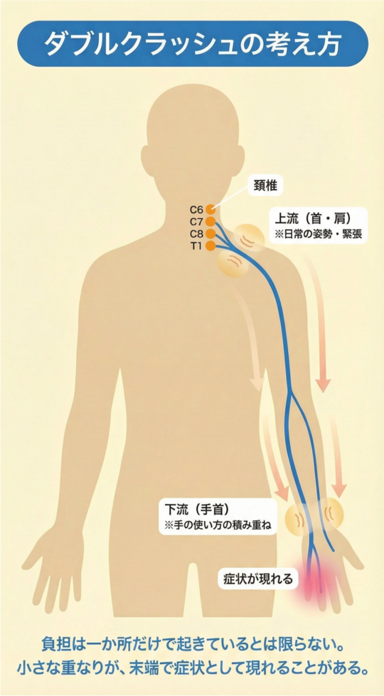 ただし、複数の部位が同時に影響している「ダブルクラッシュ」のケースもあり、単純な病名だけで判断できない場合もあります。