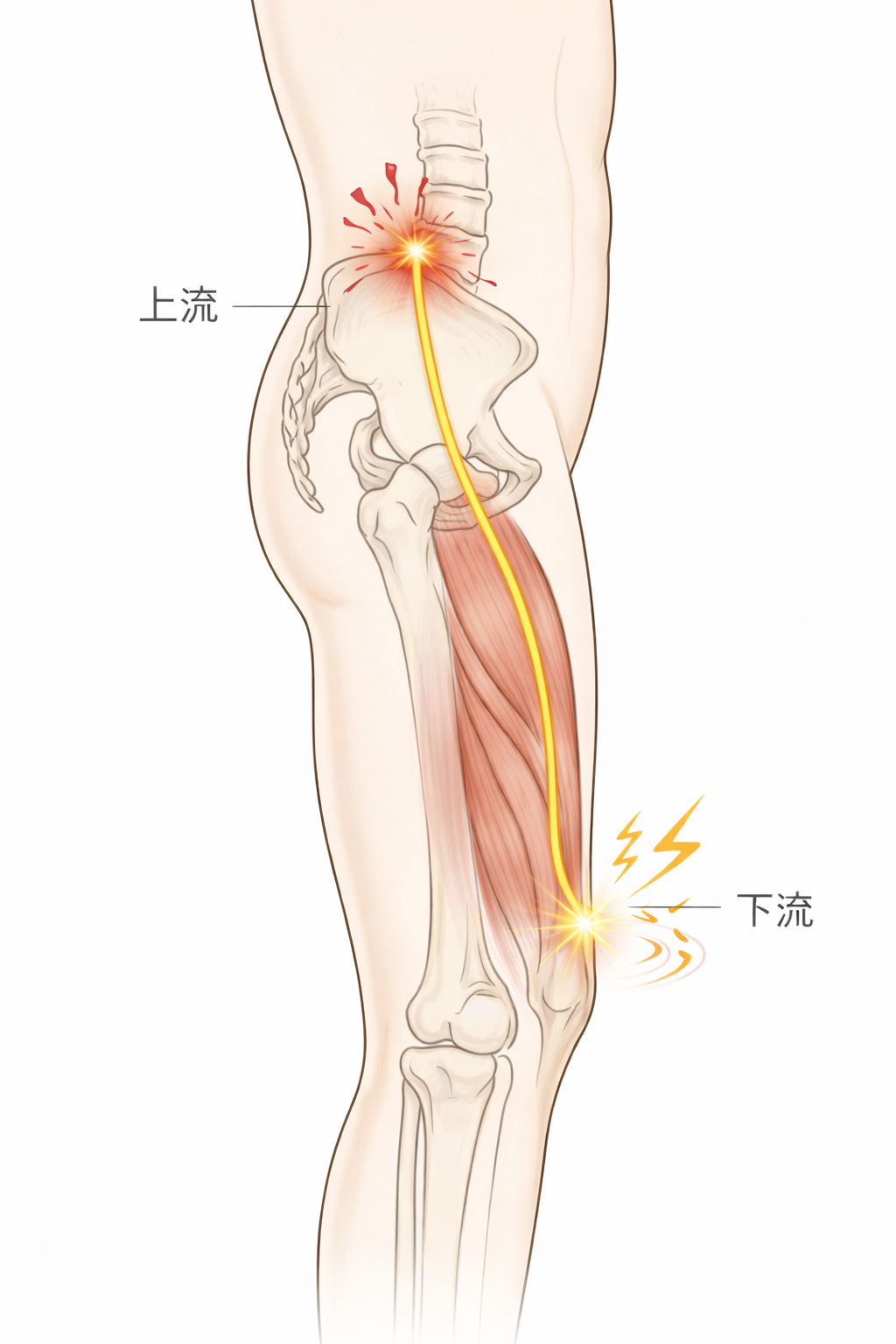 腰から太もも、膝、下腿へと連続して走っている。