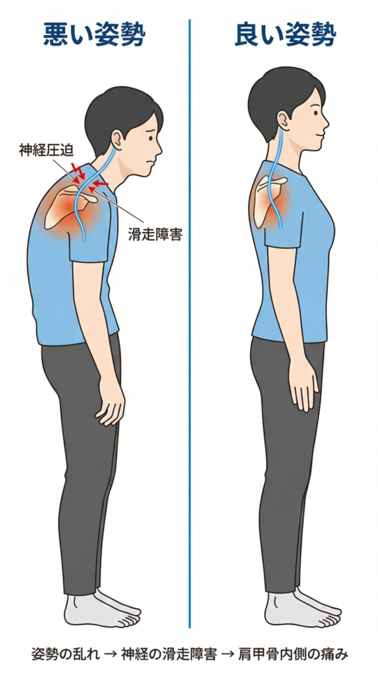 つまり、肩甲骨内側の痛みは単なる「筋肉疲労」では説明できないことが多い。