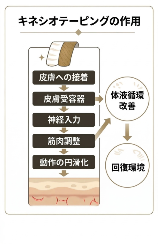 キネシオテーピングは、皮膚への微細刺激を通して神経入力を整え、神経が本来の働きを取り戻す環境を作る。