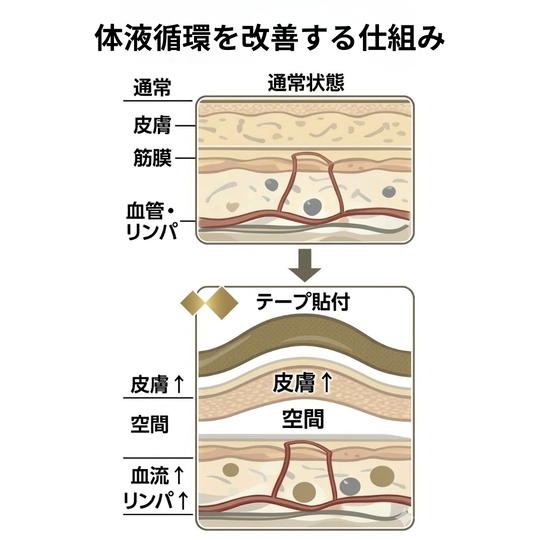 キネシオテーピングのもう一つの重要な作用は、体液循環の改善である。