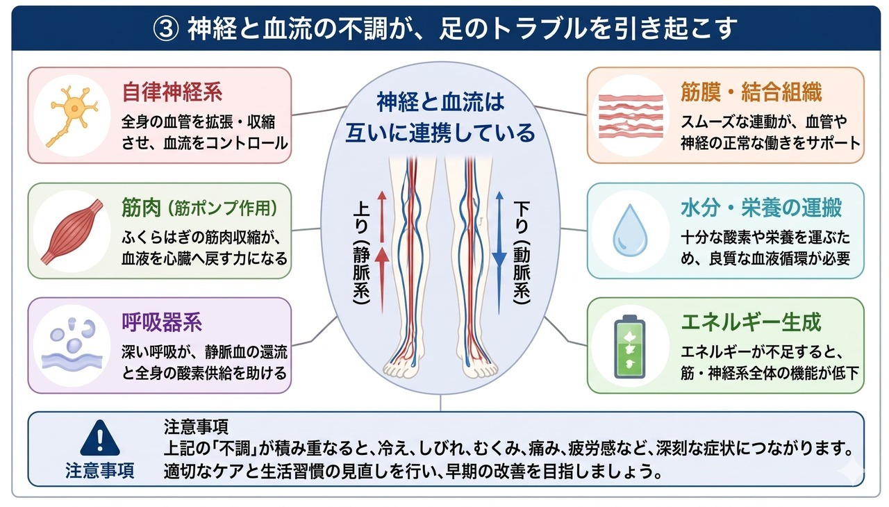 神経と血流の協調不全として足先の冷え、しびれ、重だるさが生じるのである。