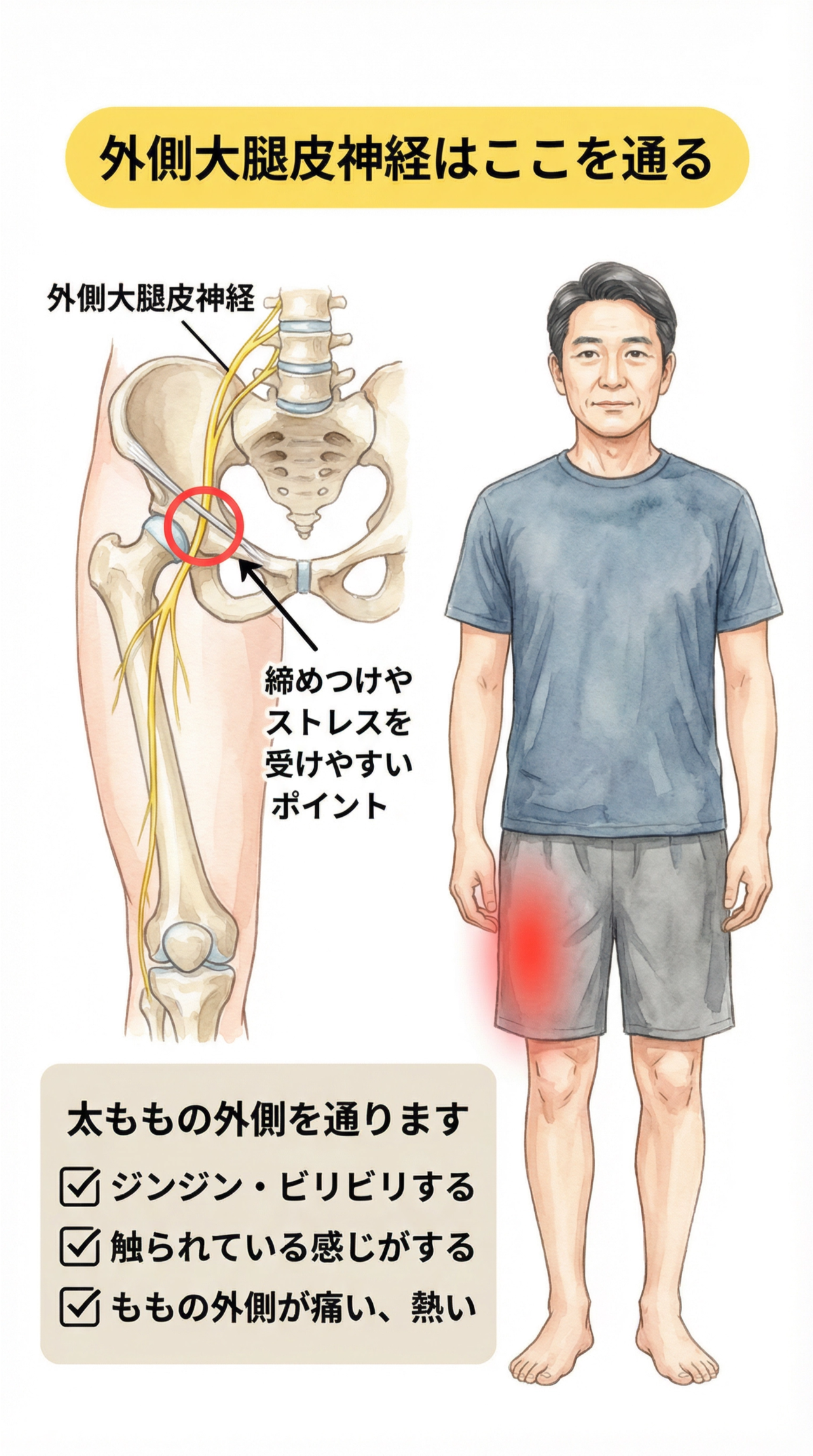 「外側大腿皮神経」が圧迫・牽引・刺激されることで