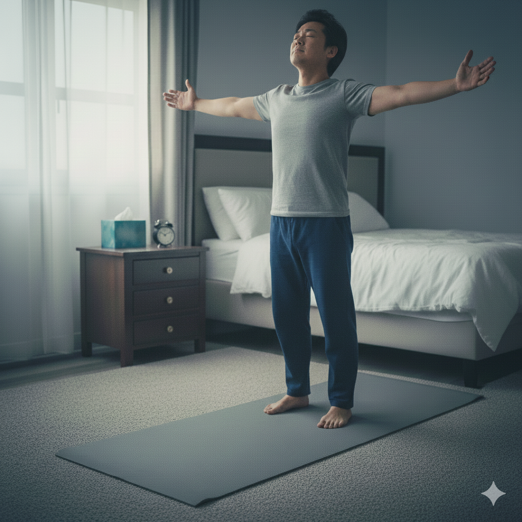 胸郭を広げ、肩を上げずにゆっくり呼吸する。