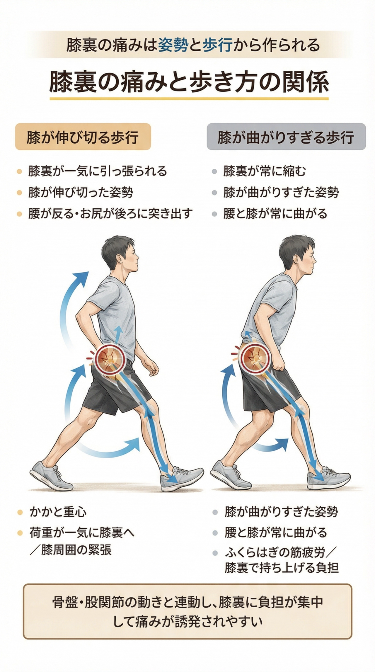 膝関節・股関節・足首の動きのバランスが崩れることで、歩くたびに膝裏にストレスがかかり、神経が刺激されて痛みを感じることがあります。