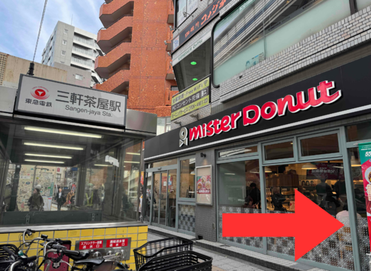 エレベーターで上がると、ミスタードーナツの前に出ます。ミスタードーナツに向かって右に進んでください。
