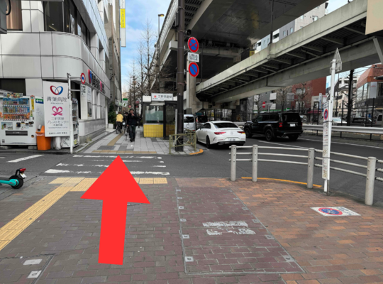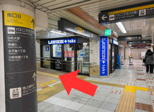 中央改札を出たら、案内板の「南口B」方面に向かってください。ローソンの前を左です。