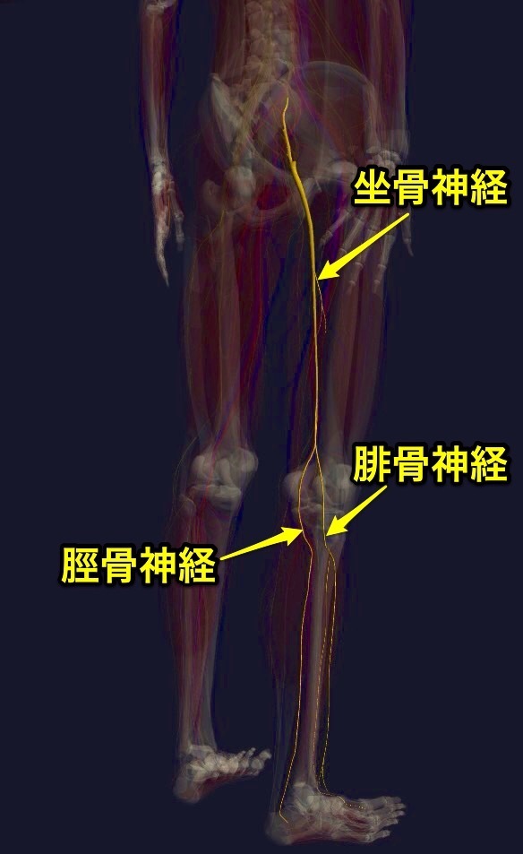 坐骨神経は、腰から骨盤・お尻・足へと続く人体で最も長い神経である。